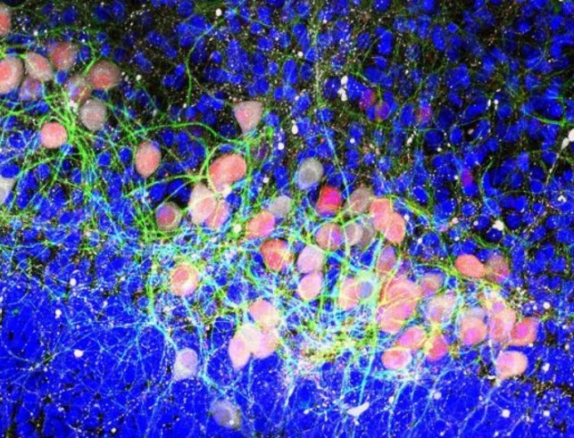 Комплексы альфа-синуклеина (зелёные), сформировавшиеся в кишечнике мышей; красным окрашены нейроны, белым – астроциты, вспомогательные клетки нервной системы. Ядерная ДНК всех клеток окрашена синим. (Фото Collin Challis / Caltech.)